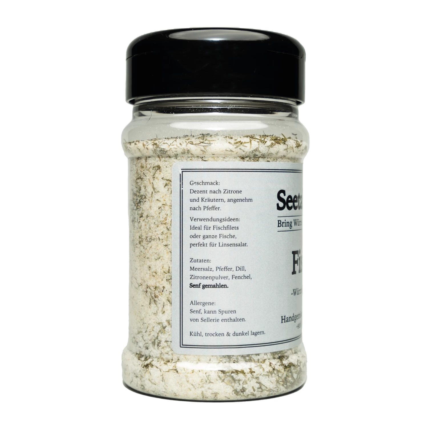 Meersalz, Pfeffer, Dill, Zitronenpulver, Fenchel, Senfpulver.